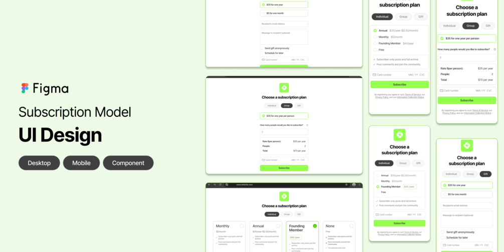 - Designs for Individual (Monthly, Annual, Founding Member, Free), Group, Gift Subscription type